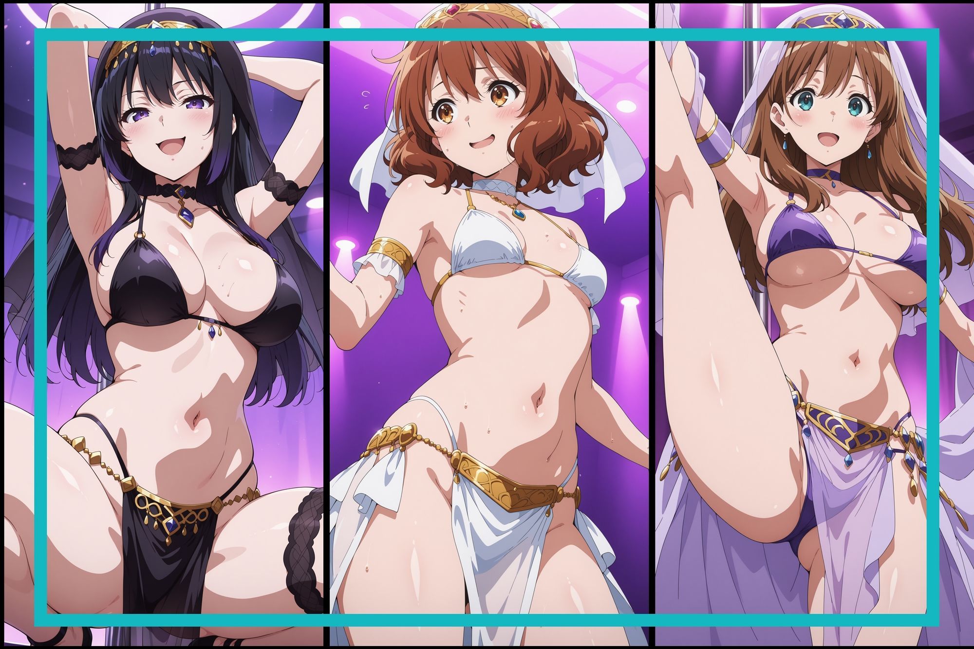 黄〇久美子と高〇麗奈と黒〇真由がベリーダンサーコスチュームを着て客とエッチをするCGイラスト集です。