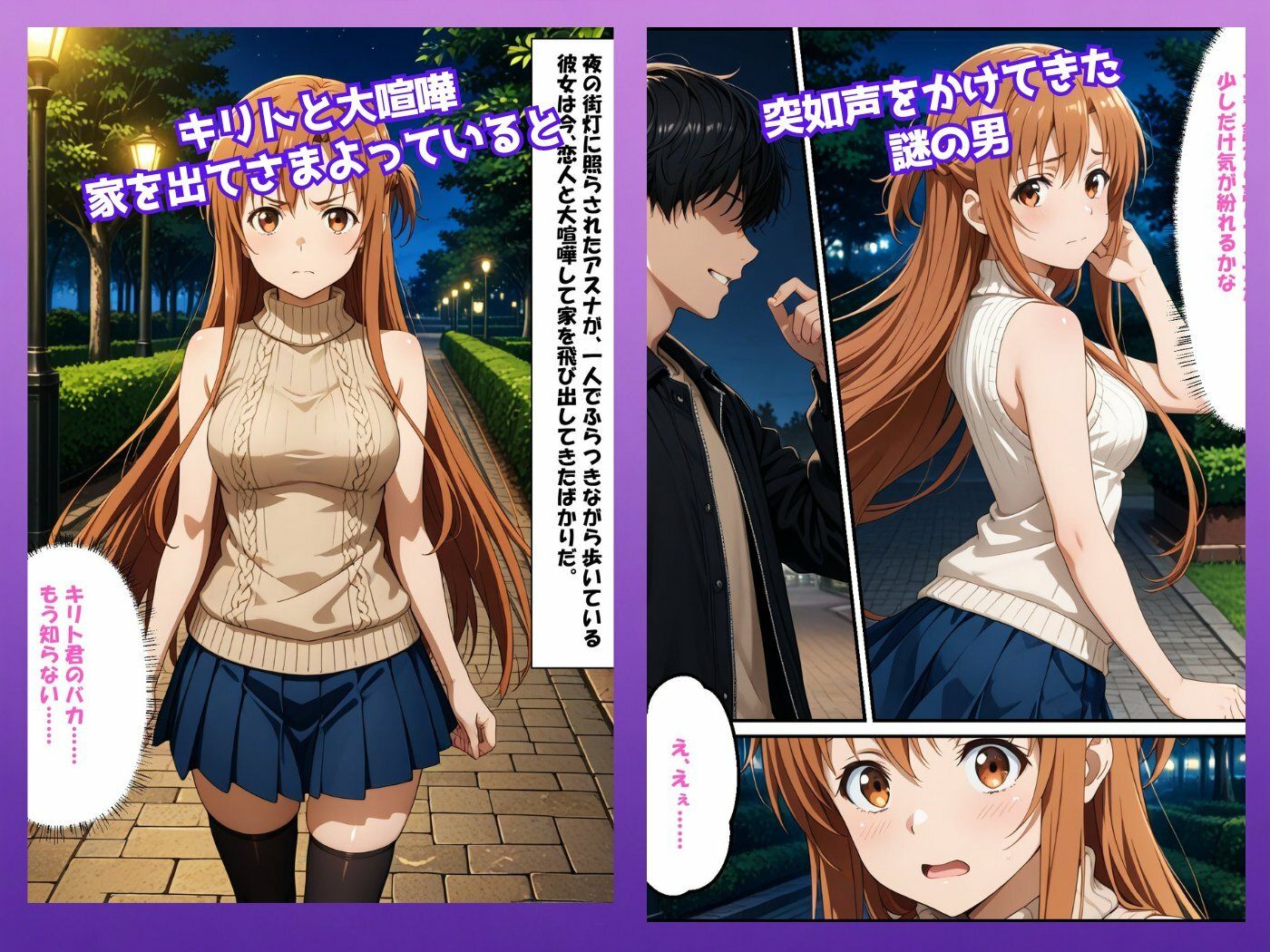 恋人と喧嘩して家を飛び出したアスナは、夜の街を歩いている途中で一人の男に声をかけられる。